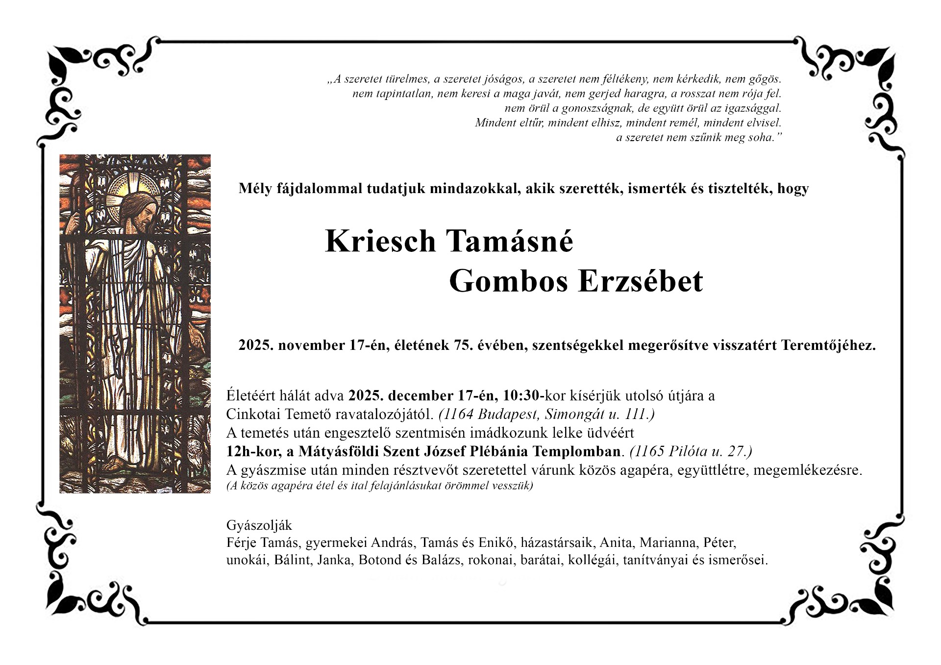 Kriesch Tamásné Gombos Erzsébet 2025. november 17-én, életének 75. évében, szentségekkel megerősítve elhunyt.